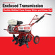 Features: Transmission enclosed in double welded case; extra metal shield keeps wires and vines out Heavy-duty tines with bolt-on replaceable blades Spring loaded steel wheels Engine guard Heavy-duty frames have reinforcement at points of stress Lift handle Drag bar.